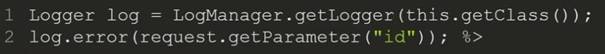 Jak potencjalnie niegroźny zapis może zostać zmanipulowany w celu wykorzystania Twojego systemu? Poniżej znajdują się dwie linijki kodu w Javie, pierwsza: utworzenie obiektu, który będzie używany dalej do logowania (Log4j) oraz druga: błąd, który będzie przekazywany z przeglądarki do systemu oraz parametr „id” od użytkownika.