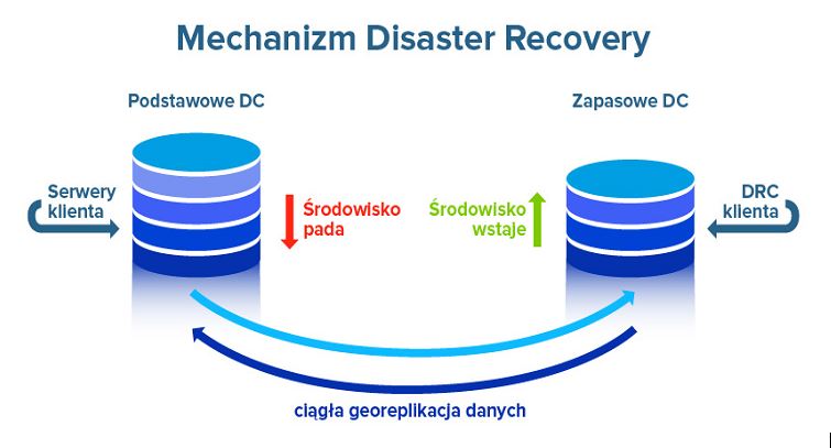 Disaster Recovery (DR) jest planem działania w przypadku wystąpienia awarii lub katastrofy, którego celem jest przywrócenie normalnego działania systemów i usług w możliwie najkrótszym czasie. W ramach strategii DR określane są procedury, narzędzia i środki niezbędne do zminimalizowania wpływu awarii na działanie firmy.