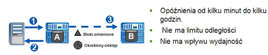 Replikacja asynchroniczna: Dane są kopiowane na drugi serwer z pewnym opóźnieniem. Daje to większą elastyczność i wydajność, ale może prowadzić do pewnego stopnia niespójności danych między replikami w przypadku awarii.