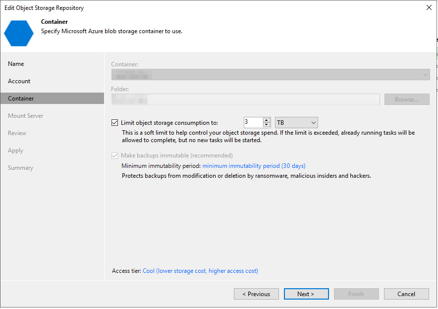 Po stronie Veeam Backup & Replication dodaliśmy nowe repozytorium typu "Object Storage". Podczas konfiguracji zaznaczyliśmy opcję: "Make backups immutable".