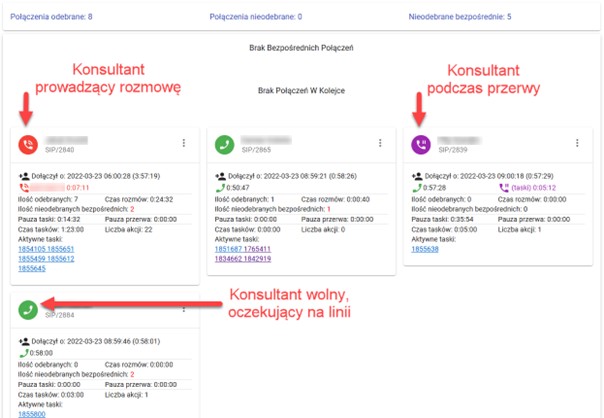 Dzięki Panelowi Obsługi Klienta Asterisk monitorujemy pracę konsultantów na pierwszej linii wsparcia (helpdesk). Widzimy w czasie rzeczywistym ilość osób podłączonych do kolejki, ilość oczekujących telefonówa także który konsultant rozmawia z jakim numerem. Dzięki podłączeniu Panelu Obsługi Klienta Asterisk z aplikacją serwisową widzimy jakie zgłoszenia są realizowane przez każdego z konsultantów oraz ile czasu zajęło każde zgłoszenie.