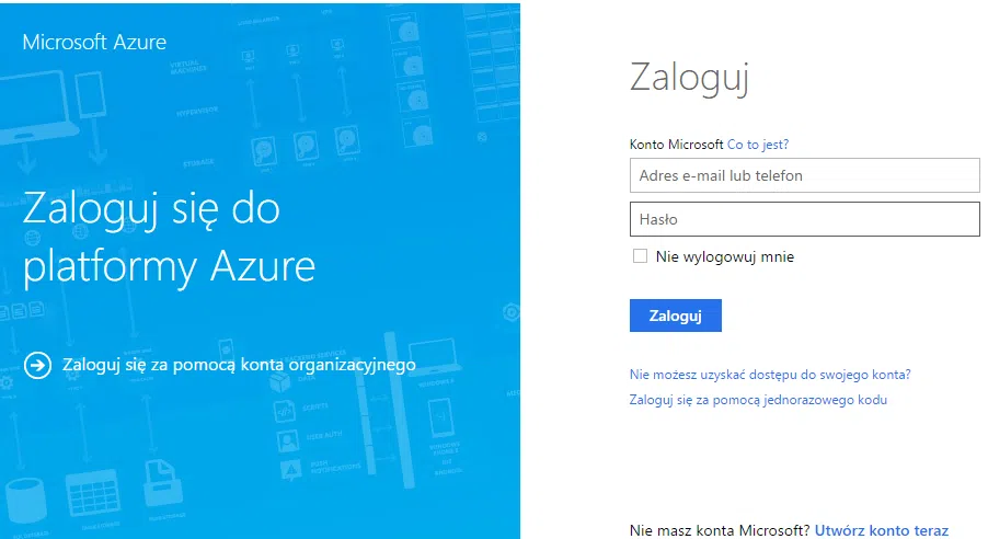 Rysunek 1. Ekran logowania platformy Microsoft Azure