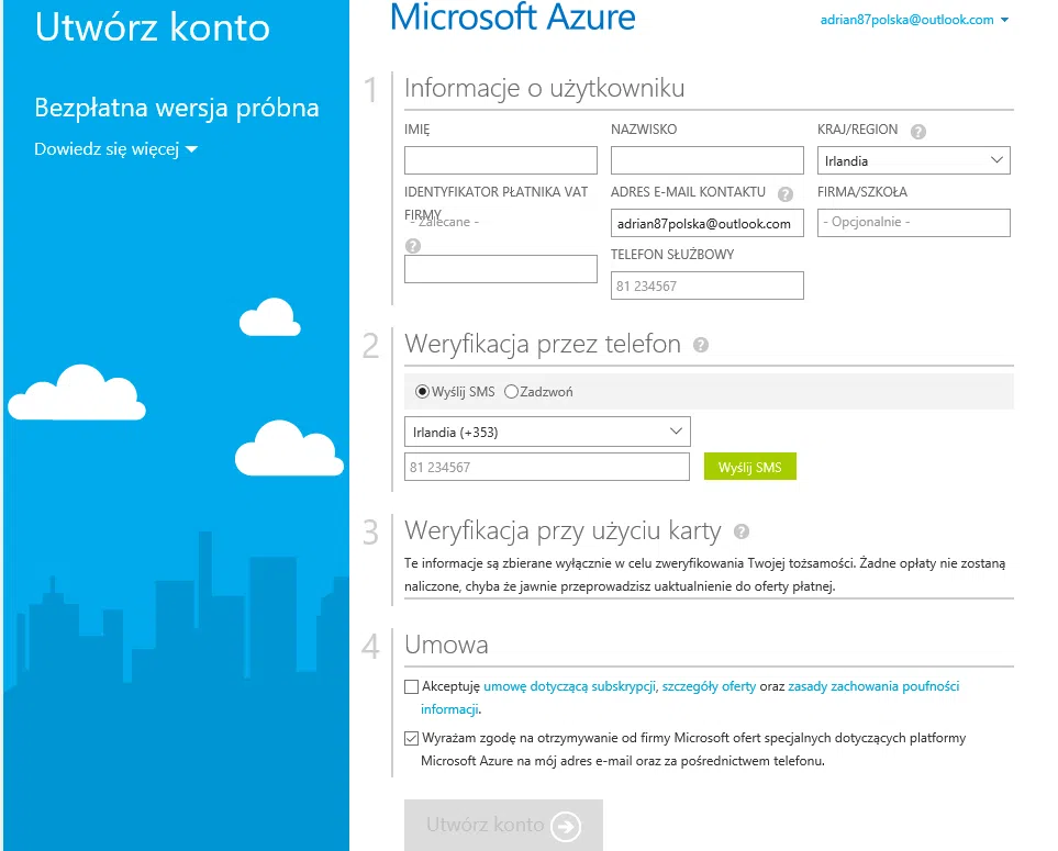 W celu utworzenia próbnego konta należy zarejestrować się na stronie https://azure.microsoft.com/pl-pl/free/