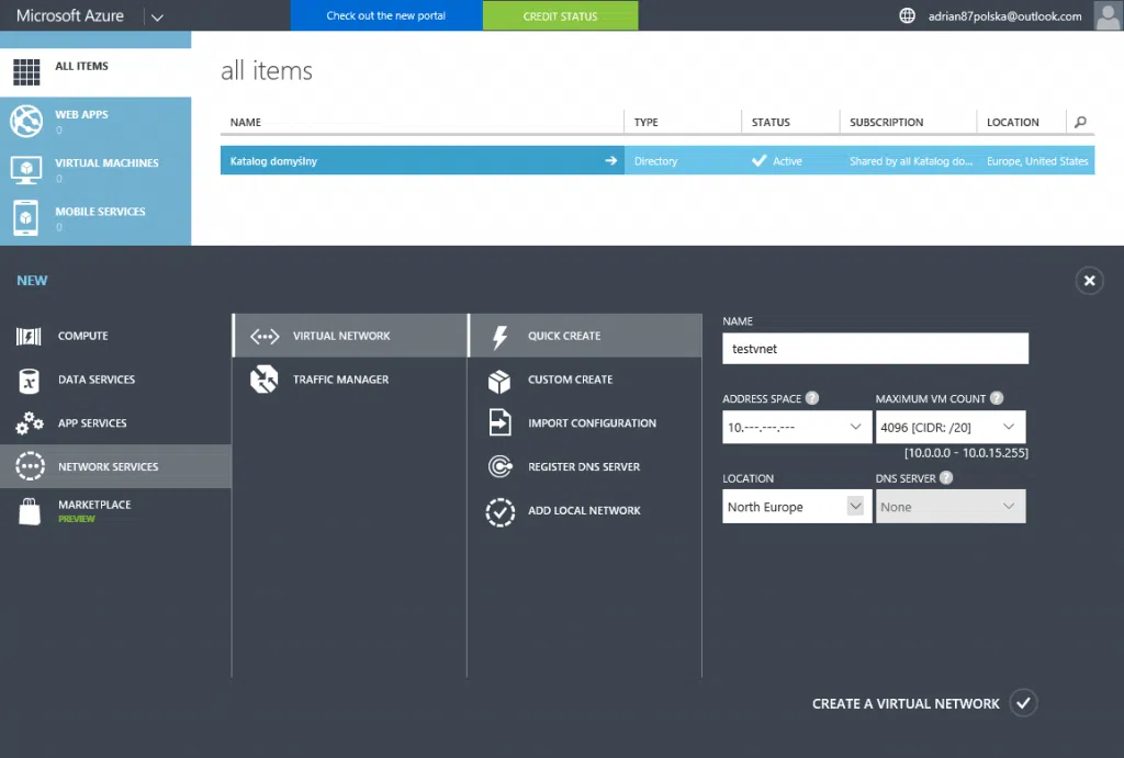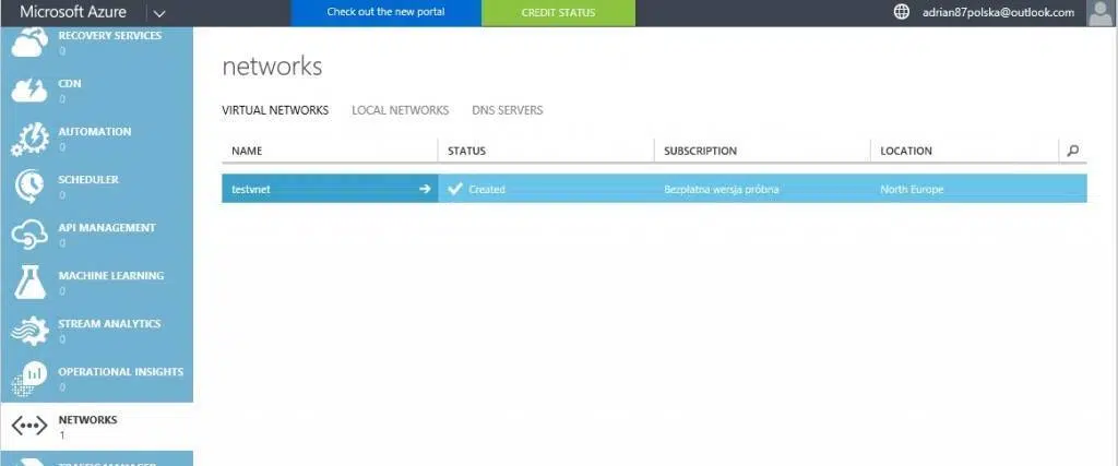 Aby stworzyć sieć należy zalogować się do portalu manage.windowsazure.com, ora