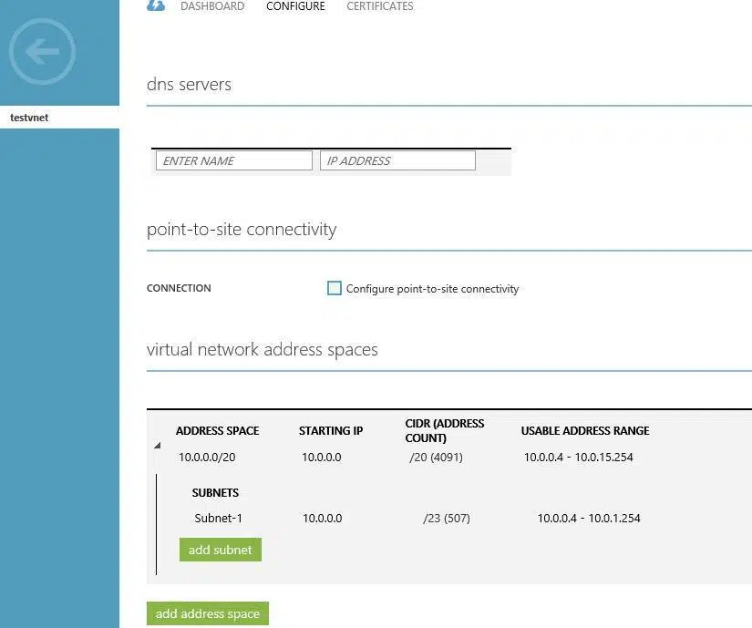 Po kliknięciu w sekcję Virtual networks na nowoutworzoną sieć: „testvnet” będzie można zobaczyć i edytować jej właściwości.