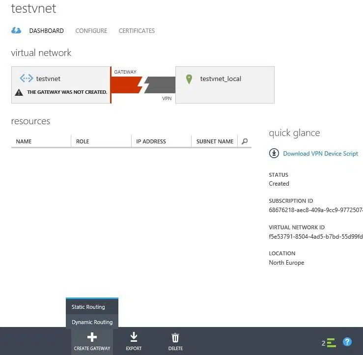 Następnie przejść do sekcji dashboard, U dołu ekranu przejść do przycisku Create Gateway i wybrać jedną z opcji. Wybór zależy od możliwości urządzenia po stronie sieci lokalnej. Do celów ćwiczenia została wybrana opcja statycznego routingu.
