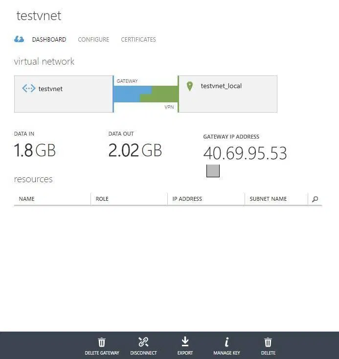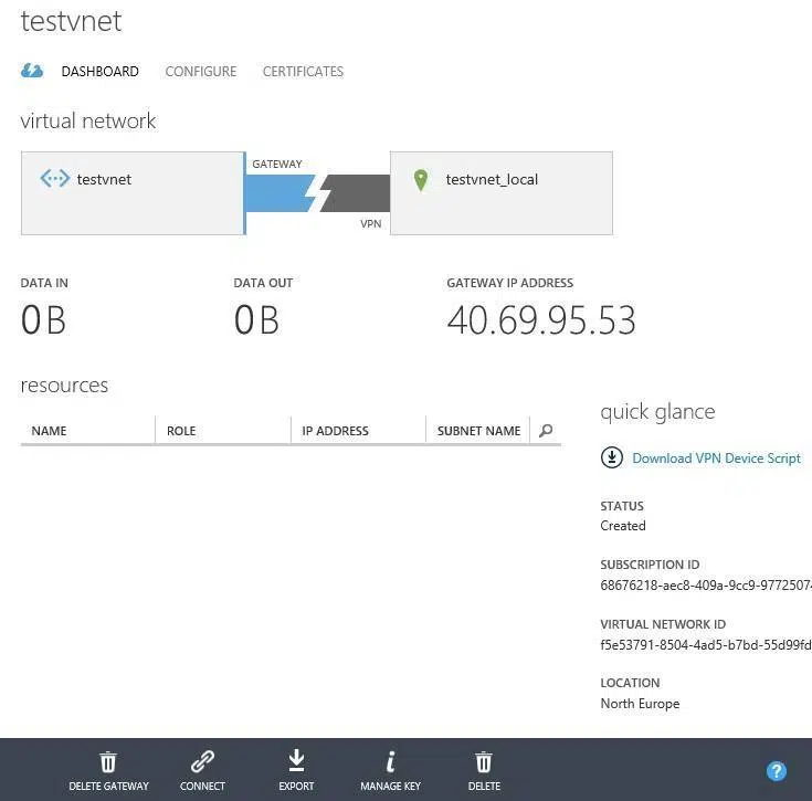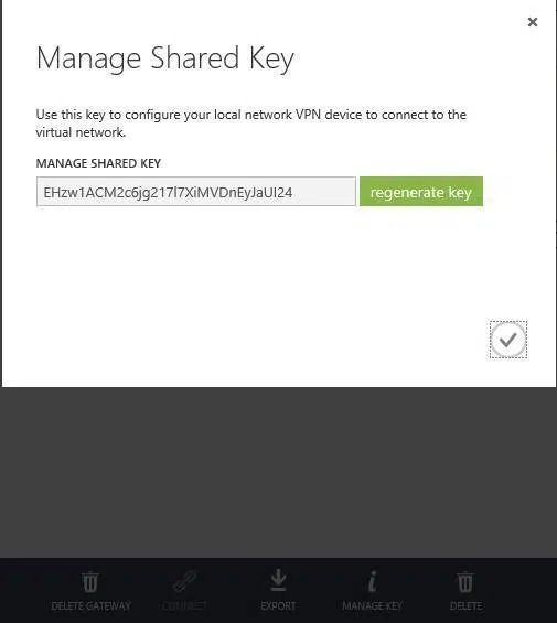 Tworzenie bramy trwa do godziny. Tak długi czas związany jest z faktem, że tworzona Dlatego nie zaleca się, aby po utworzeniu bramy wyłączać ją. Gdy brama zostanie pomyślnie utworzona należy u dołu ekranu kliknąć na przycisk Manage key i skopiować jego wartość do odpowiedniego miejsca w konfiguracji bramy VPN po stronie sieci lokalnej.