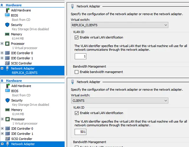 W biurze klienta Support Online skonfigurowane są dwie kluczowe wirtualne sieci lokalne VLAN: Jedna z nich to DMZ (demilitarized zone) – obszar sieci, oddzielony od sieci wewnętrznej, w której znajdują się serwery m.in. hostujące strony internetowe, na które prawdopodobieństwo cyberataku jest większe, dzięki czemu atakującemu uniemożliwiony jest dostęp do sieci lokalnej. Druga sieć wirtualna jest siecią wewnętrzną, w której znajduje się pozostała infrastruktura IT. Obydwie sieci muszą zostać jednakowo skonfigurowane po stronie zreplikowanego środowiska, aby odwzorować konfigurację sieciową w biurze klienta.
