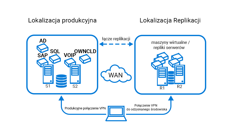 Każdy z pracowników może się połączyć poprzez zapasowy profil VPN na swoim komputerze do zapasowego środowiska i pracować na udostępnionych tam zasobach.