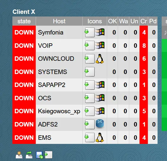 Widok podczas awarii z panelu aplikacji, monitorującej serwery klienta