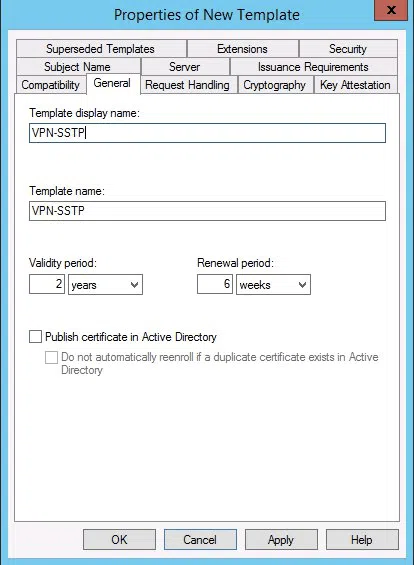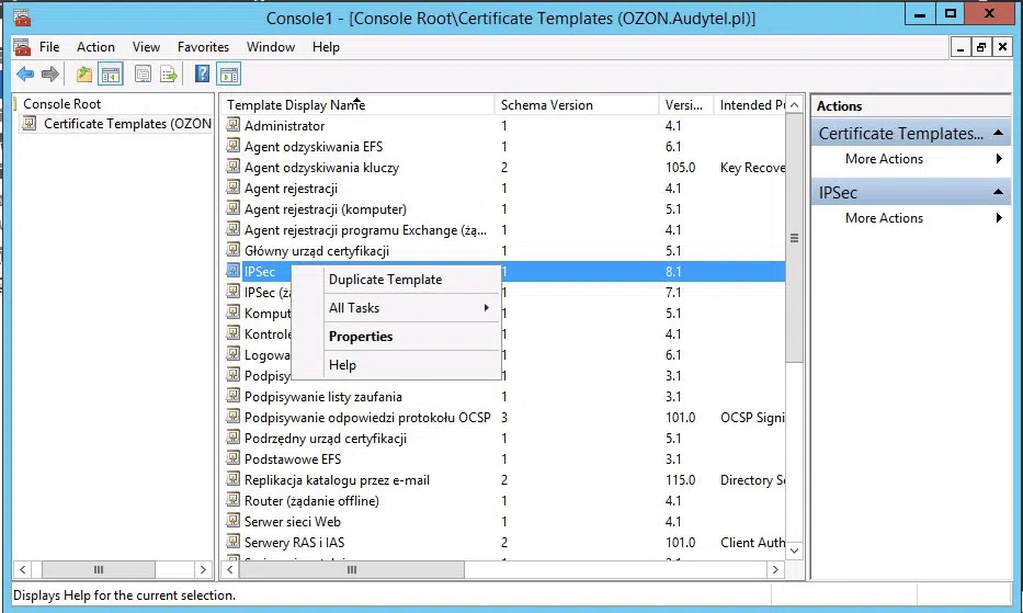 Przechodzimy do konfiguracji naszego certyfikatu. Posłużymy się w tym celu gotowym szablonem IPSec, który zduplikujemy i skonfigurujemy.