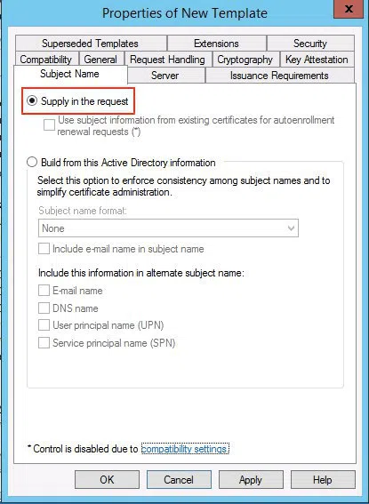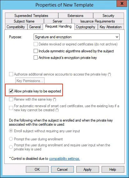 Przechodzimy do zakładki „Request Handling” i zaznaczamy „Allow privet key to be exported” dzięki czemu uzyskamy możliwość exportu certyfikatu i będziemy mogli zainstalować go na komputerach użytkowników.