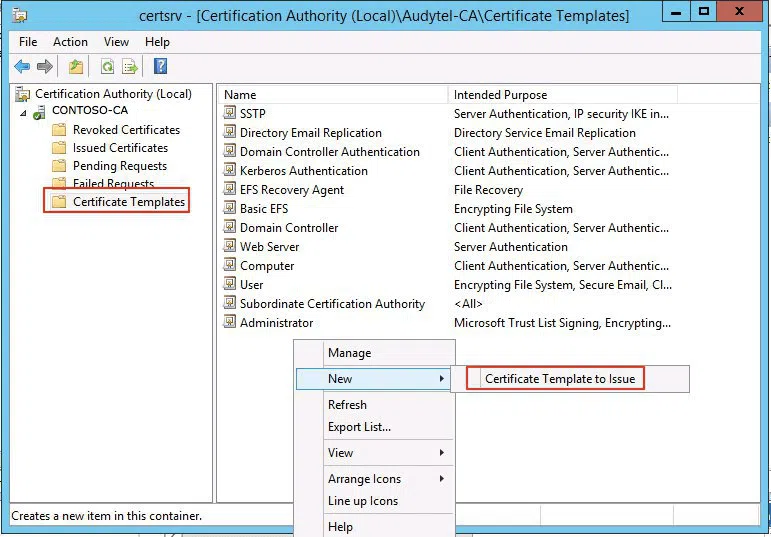Po zapisaniu ustawień przechodzimy do „Certification Authority” i dodajemy nasz nowo utworzony szablon w podkatalogu „Certificate Templates”.