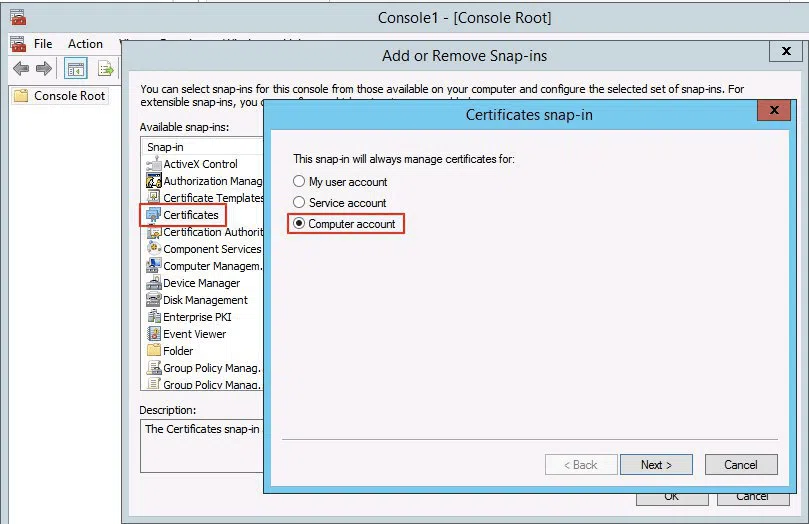 W pierwszym kroku musimy wyexportować certyfikat z serwera, a następnie zaimportować na komputerze użytkownika.
