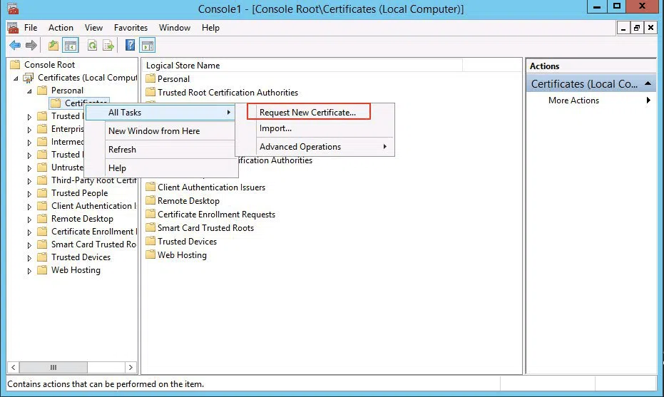 Możemy przejść do generowania certyfikatu naszego serwera. Otwieramy przystawkę „Certificates”.