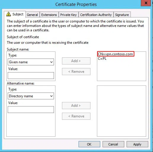 UWAGA! W poniższym kroku ustawiamy Common Name, który będzie używany przy konfiguracji połączenia na komputerze użytkownika – podajemy go jako „Adres internetowy”. Jeśli podamy inną nazwę nie uda nam się nawiązać połączenia.