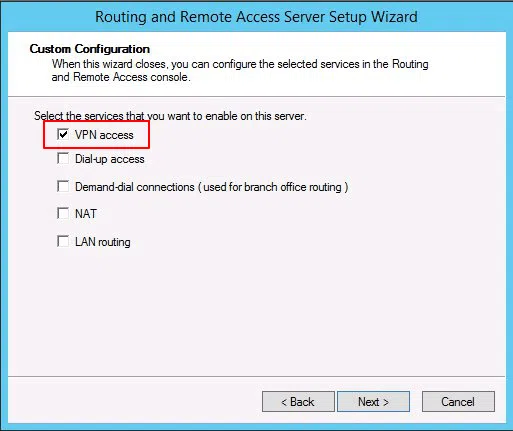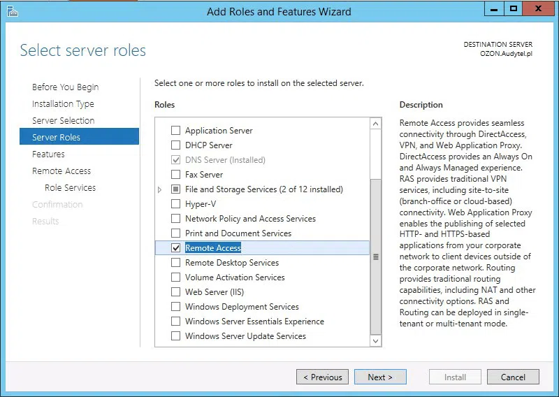 Instalujemy rolę „Remote Access”, w „Role Services” zaznaczamy „DirectAccess and VPN (RAS)”.