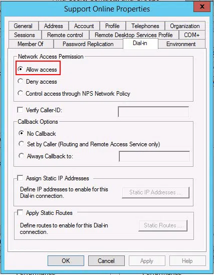 Ostatnią zmianą po stronie serwera jest zezwolenie użytkownikom na dostęp do sieci. W tym celu w Active Directory przechodzimy do właściwości użytkownika, który ma posiadać dostęp i w zakładce „Dial-in” zaznaczamy „Allow access”.