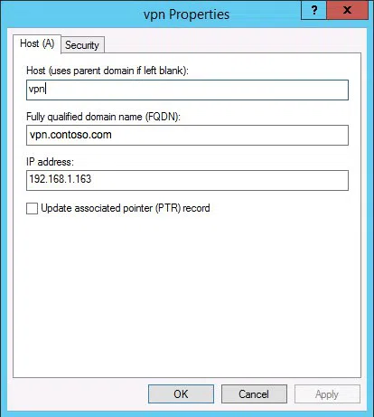 Dodajemy host A przekierowujący z adresu vpn.contoso.com na zewnętrzny adres IP, oraz dodajemy przekierowanie wskazujące na adres IP serwera, na którym mamy skonfigurowany SSTP.