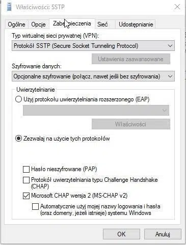 Po utworzeniu połączenia przechodzimy do jego właściwości i w zakładce „Zabezpieczenia” wymuszamy protokół SSTP oraz zezwalamy na użycie protokołu „Microsoft CHAP wersja 2”.