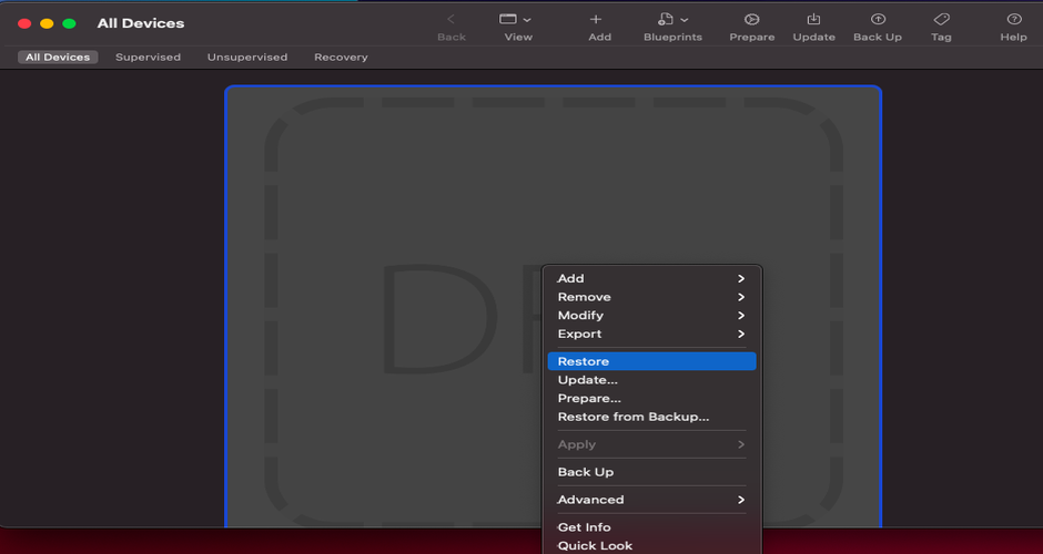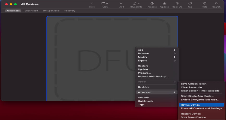 Na uszkodzonym komputerze należy wcisnąć przycisk power i trzymając go wcisnąć dodatkowo klawisze: prawy Shift, lewy Option i lewy Control przez około 10s. Jeśli przytrzymane będą za krótko lub za długo komputer nie wejdzie w tryb DFU, który jest naszym celem. Na sprawnym MacBooku w programie Apple Configurator 2 powinien się pokazać napis DFU. Jeśli tak się stało, to jesteś już bardzo blisko sukcesu.