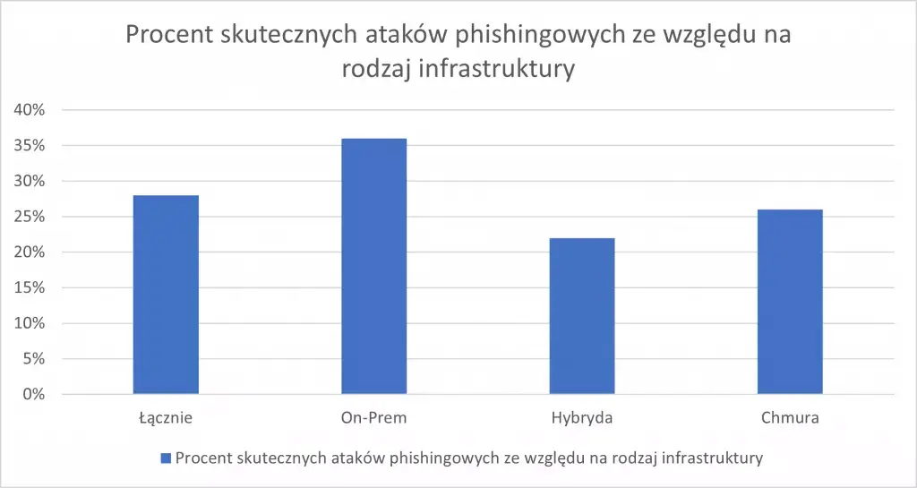 Z kolei według badań przeprowadzonych przez Microsoft dotyczących bezpieczeństwa pracy podczas pandemii Covid-19, 90% firm zgłaszało phishing jako zagrożenie, które miało największy i bezpośredni wpływ na ich działalność. Dodatkowo 28% ankietowanych przyznało, że atakującym udało się skutecznie przeprowadzić atak na pracowników ich firmy. Powyższy wykres przedstawia skuteczność ataków przeprowadzonych na konkretne rozwiązania. Jak widać rozwiązania lokalne znacznie częściej, bo aż w 36%, padały ofiarami skutecznych ataków. W przypadku rozwiązań chmurowych było to o 10 punktów procentowych mniej, zaś hybrydowe – 22%.