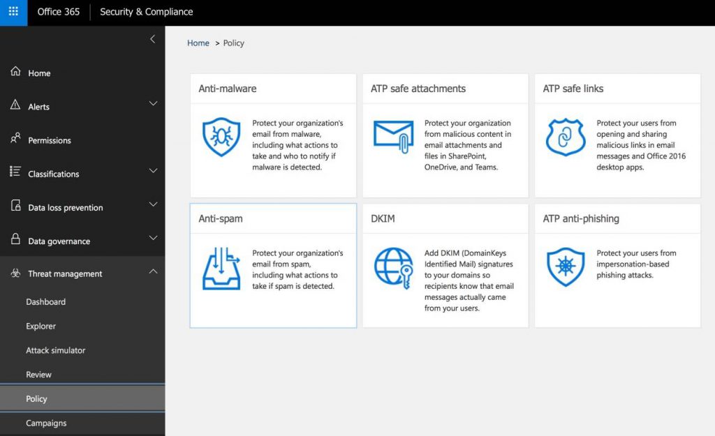 Co więc sprawia że rozwiązania chmurowe są znacznie bezpieczniejsze? Na pewno duże znaczenie ma szereg wbudowanych rozwiązań, których wdrożenie w przypadku serwerów lokalnych wymagałoby przeznaczenia dużej ilości czasu i środków, by działałby tak samo skutecznie. Przykładowy wygląd panelu administracyjnego poczty Microsoft 365 oraz polityk bezpieczeństwa: