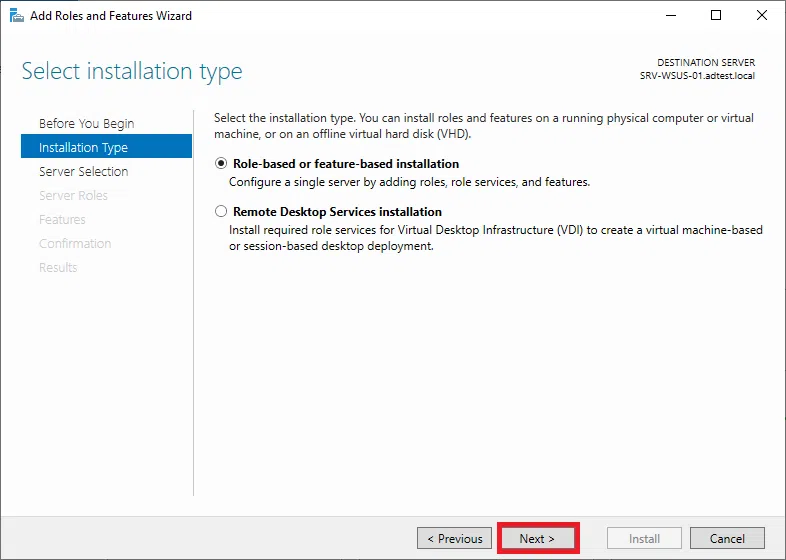 - Na stronie select installation type wybierz Role-based or feature-based installation, a następnie kliknij Next.