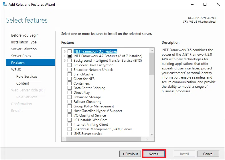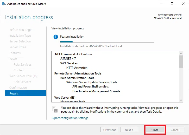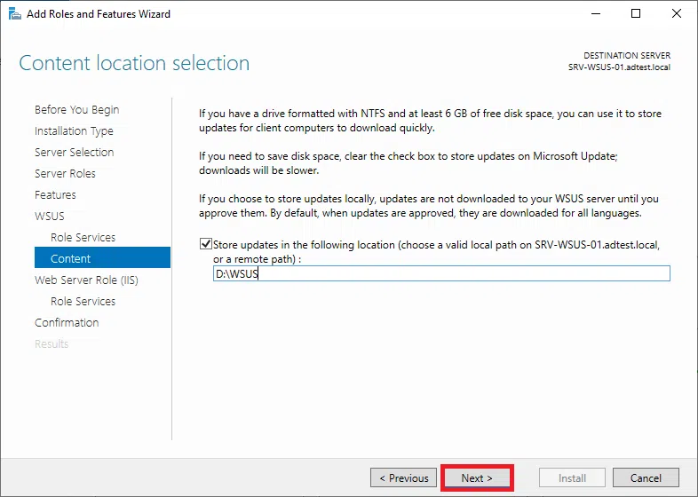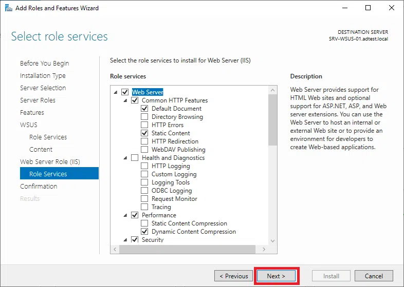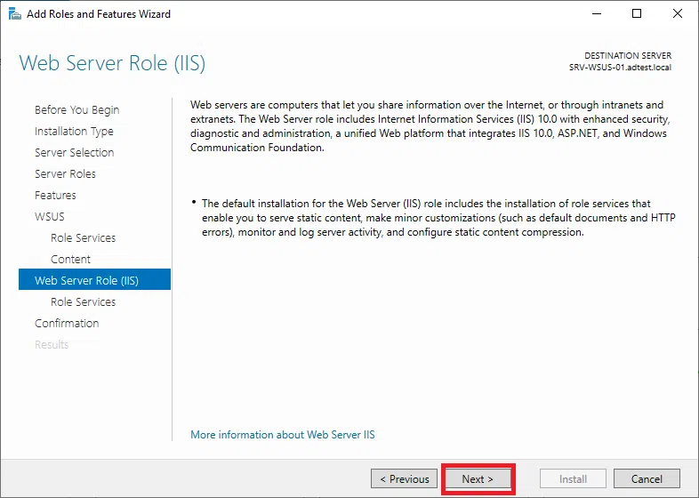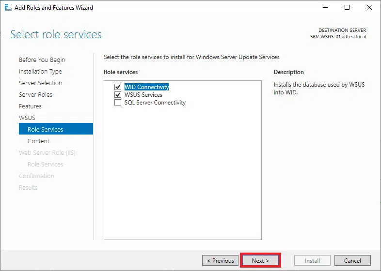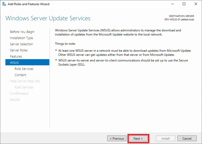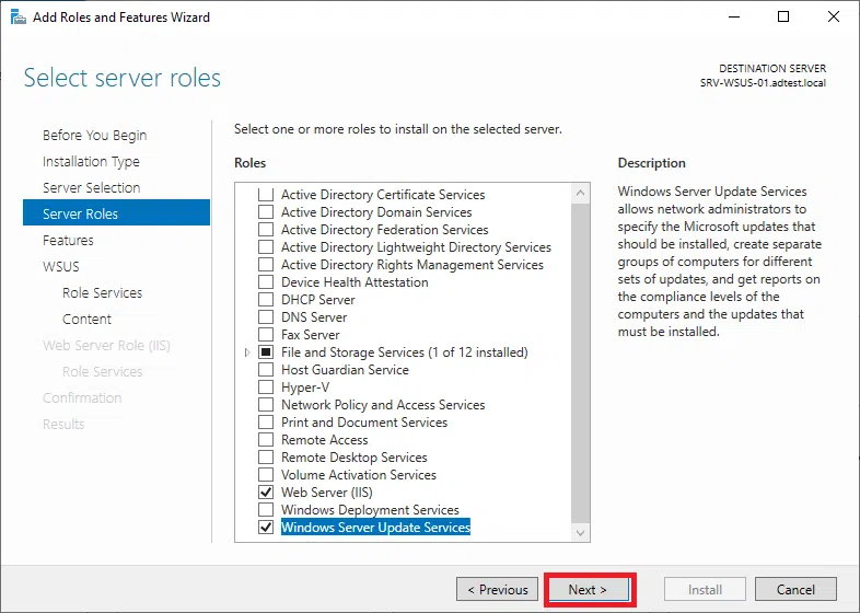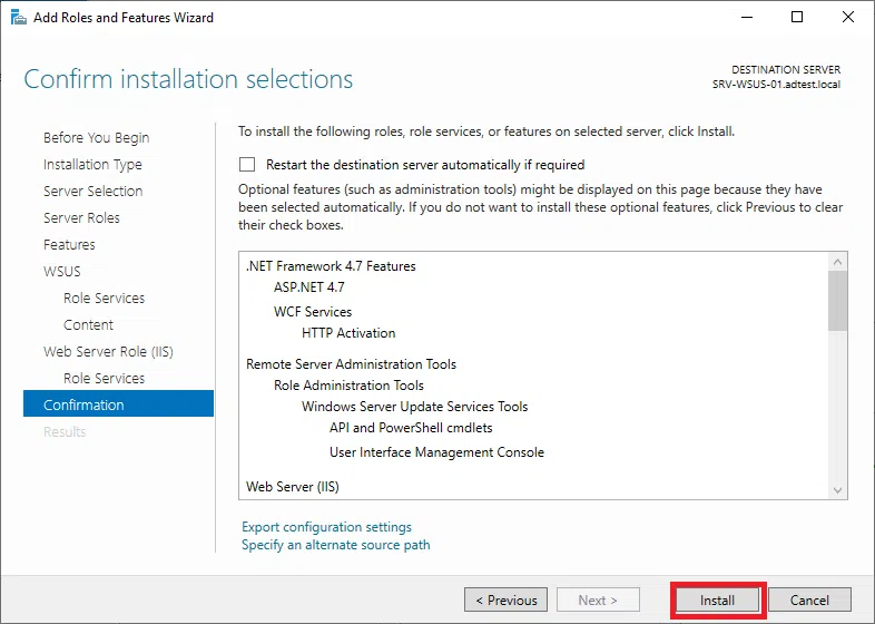 Potwierdź instalację WSUS klikając na Install.