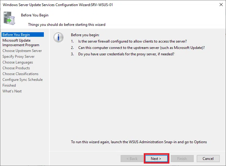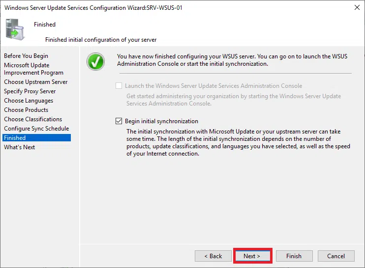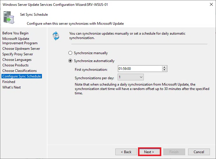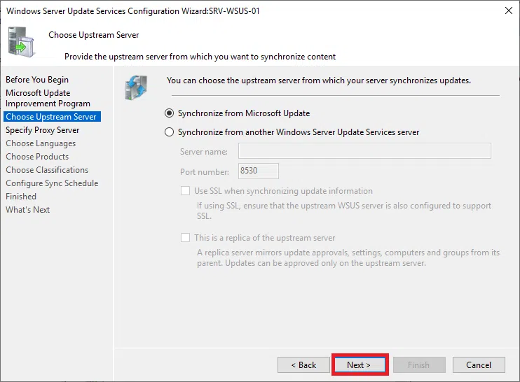 Wybierz Synchronizuj z Microsoft Update, ponieważ będzie to jedyny serwer WSUS. Następnie kliknij Next.