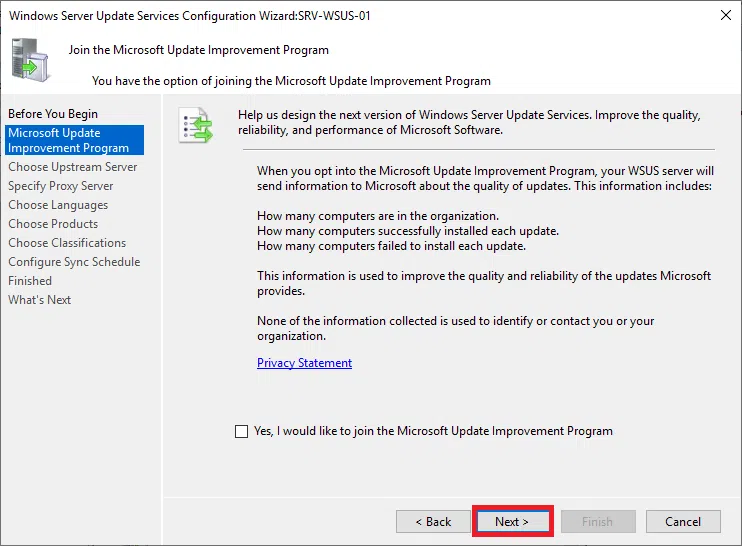 Następnie odznacz opcję Yes I would like to join the Microsoft Update Improvement Program, jeżeli nie chcesz brać udziału w programie.