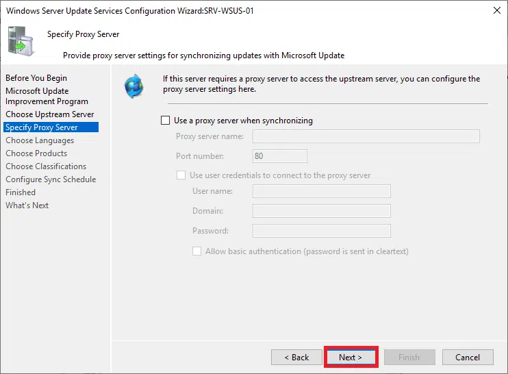Gdy w środowisku sieciowym występuje serwer proxy, zaznacz opcję Use a proxy server when synchronizing oraz uzupełnij dane uwierzytelniające odpowiednie dla serwera proxy. Następnie kliknij Next.