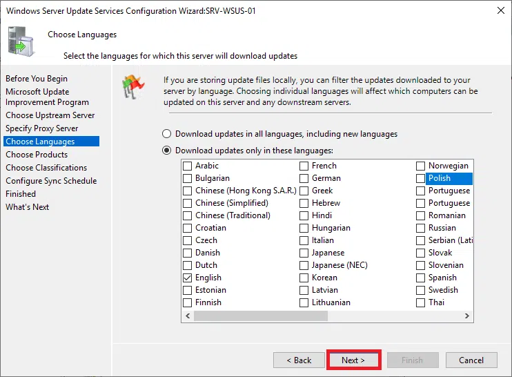 W sekcji Choose Languages wybierz języki aktualizacji, które mają być przechowywane na serwerze WSUS. W celu zaoszczędzenia miejsca rekomenduje się wybrać tylko te języki, które są wykorzystywane w twojej organizacji i kliknąć Next.