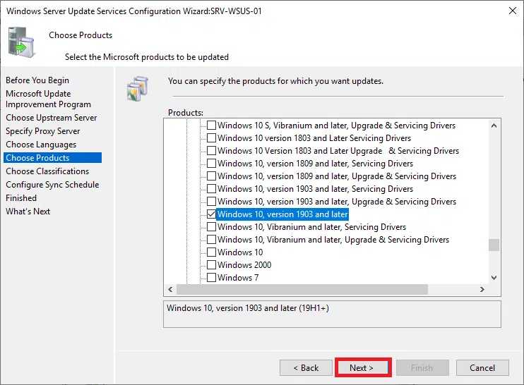 W kolejnej sekcji wybierz produkty, dla których mają być przetrzymywane aktualizacje na serwerze aktualizacji. Wybierz Next.