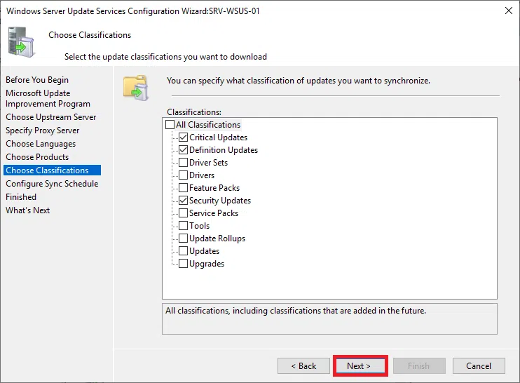 Następnie wybierz rodzaje aktualizacji, które mają być przechowywane przez serwer aktualizacji. Po wybraniu interesujących Ciebie aktualizacji kliknij Next.