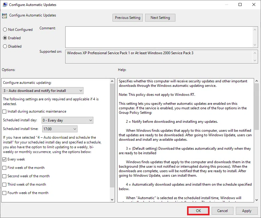 Otwórz istniejącą zasadę grupy lub utwórz nową. W zasadzie grupy przejdź do Computer Configuration > Policies > Administrative Templates > Windows Components > Windows Update. Wybierz Configure Automatic Updates następnie zaznacz Enable i wybierz sposób dostarczania aktualizacji oraz kiedy mają być instalowane.