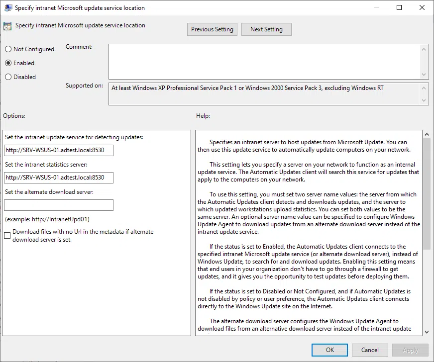 Kolejną ważną rzeczą, którą powinieneś skonfigurować jest określenie lokalizacji intranetowej usługi aktualizacji firmy Microsoft. Ideą tej zasady grupy jest poinformowanie komputerów o istnieniu intranetowego serwera aktualizacji. W przypadku, w którym to ustawienie nie zostanie skonfigurowane, komputery nie będą wiedziały o lokalnym źródle poprawek. Przy wykorzystaniu połączenia szyfrowanego należy na końcu wpisać port 8531.