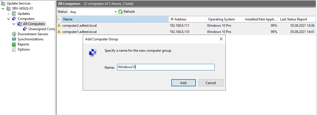 Po uruchomieniu konsoli WSUS zobaczysz dwie domyślne grupy komputerów — All computers i Unassigned computers. Przed wdrożeniem aktualizacji w organizacji warto je przetestować na wybranej grupie. W tym celu utwórz grupę testową. Rozwiń nazwę serwera WSUS, następnie Computers. Kliknij prawym przyciskiem na All computers i z menu rozwijanego wybierz Add computer Group. Podaj nazwę dla grupy testowej i kliknij Add.