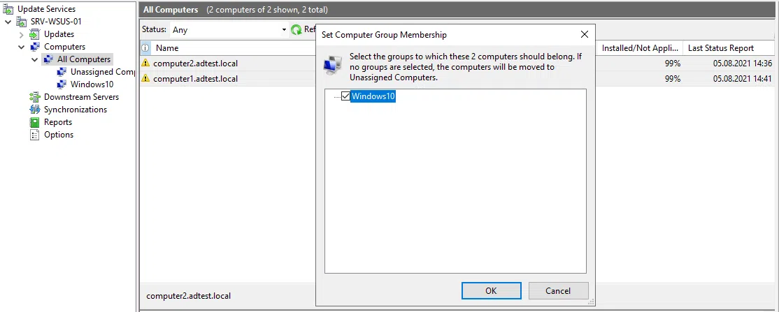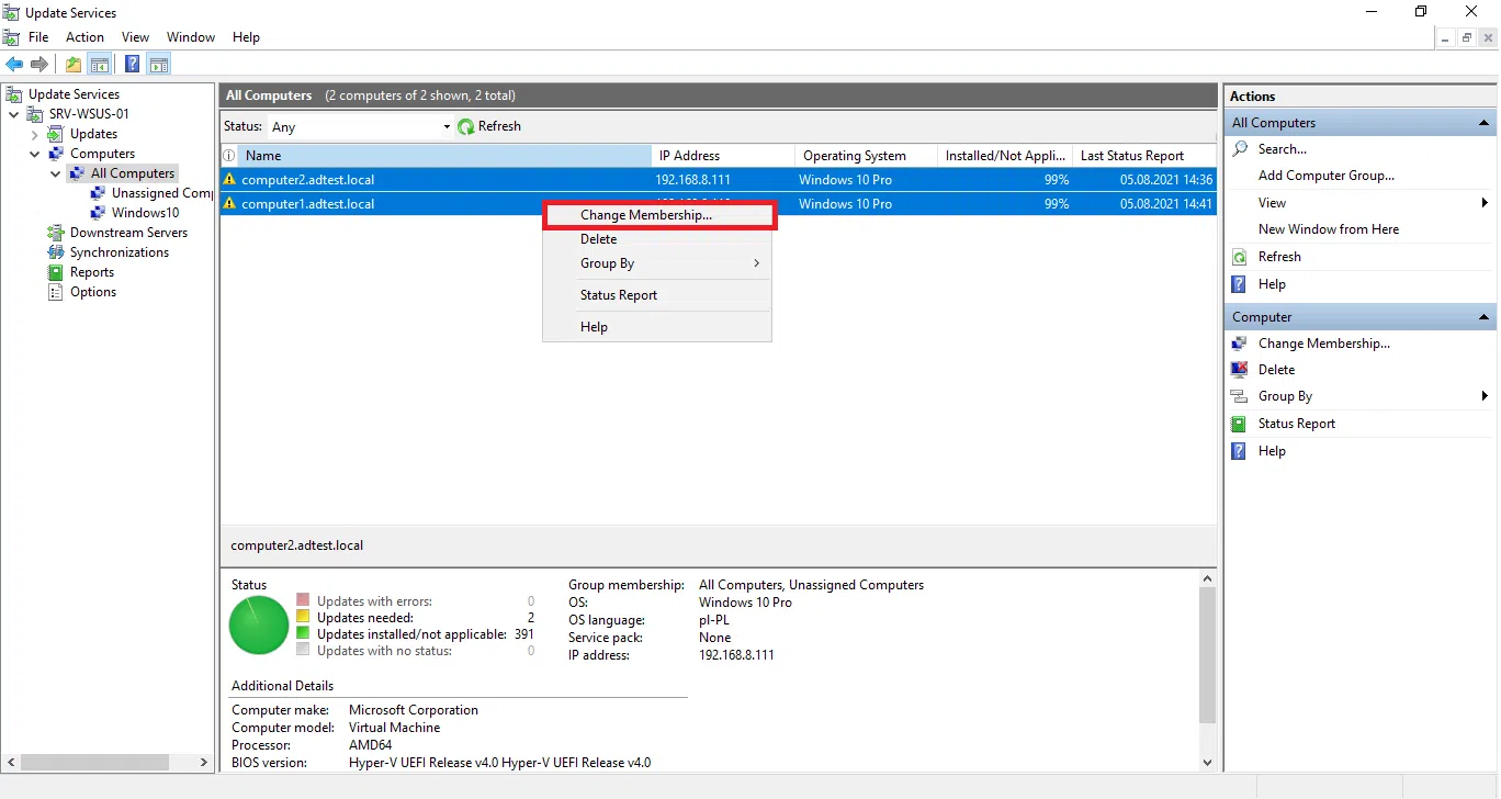Po kliknięciu na grupę All computers powinieneś zobaczyć wszystkie komputery, które nawiązały połączenie z serwerem aktualizacji. Zaznacz wybrane komputery i kliknij na nich prawym przyciskiem następnie wybierz Change Membership z menu rozwijanego.
