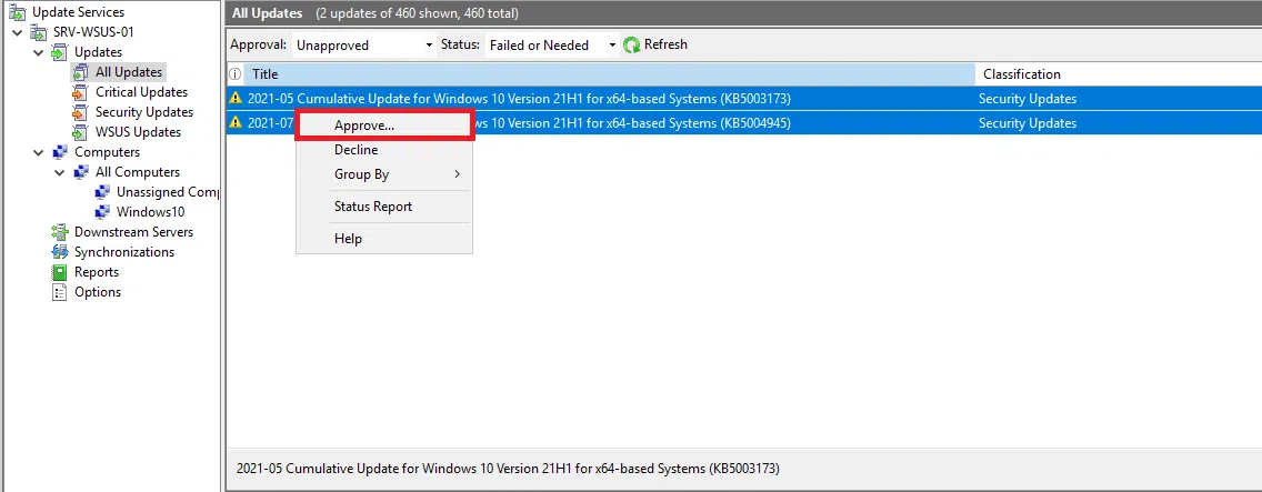 Po utworzeniu grupy testowej Windows10 należy zatwierdzić aktualizacje, które mają zostać wdrożone. Uruchom konsolę administracyjną WSUS, a następnie kliknij Updates and All Updates. W sekcji All Updates wybierz aktualizacje, które chcesz zatwierdzić dla grupy testowej kliknij prawym przyciskiem na wybranych aktualizacjach. Wybierz Approve.