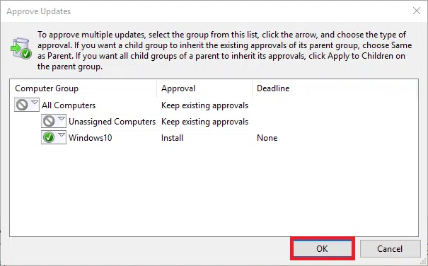 W oknie Approve Updates na grupie testowej Windows 10 kliknij prawym przyciskiem i wybierz Approved for Install a następnie kliknij OK.