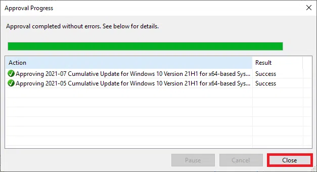 Po kliknięciu OK zostanie wyświetlone okno Approval Progress, które pokazuje postęp zadań mających na celu zatwierdzenie aktualizacji. Po zakończeniu procesu akceptacji kliknij Close.