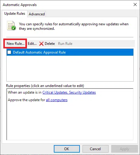 Zatwierdzanie aktualizacji może również odbyć się w sposób automatyczny. Powinieneś w tym celu skonfigurować regułę automatycznego zatwierdzania w usługach Windows Server Update Services. Uruchom konsolę administracyjną, następnie rozwiń serwer WSUS i wybierz Options. W Options wybierz Automatic Approvals. W oknie zobaczysz domyślną regułę automatycznego zatwierdzania, którą możesz edytować i używać. W tym miejscu utwórz nowe reguły automatycznego zatwierdzania aktualizacji. Kliknij na New Rule.