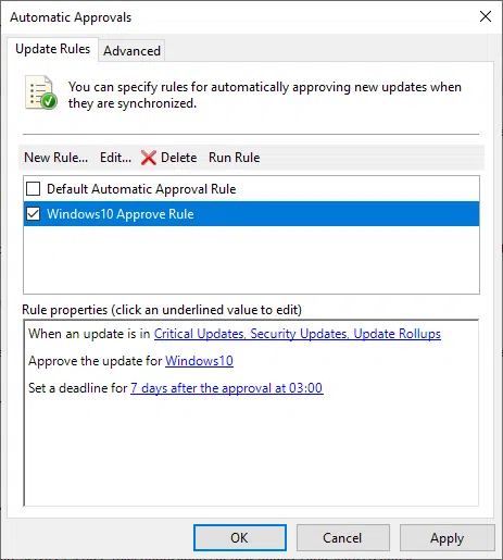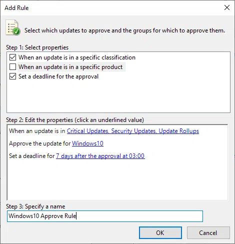 Zaznacz pole When an update is in a specific classification i wybierz klasyfikację aktualizacji, następnie przypisz regułę dla wybranej grupy. Na koniec ustaw termin zatwierdzenia aktualizacji i określ nazwę reguły.