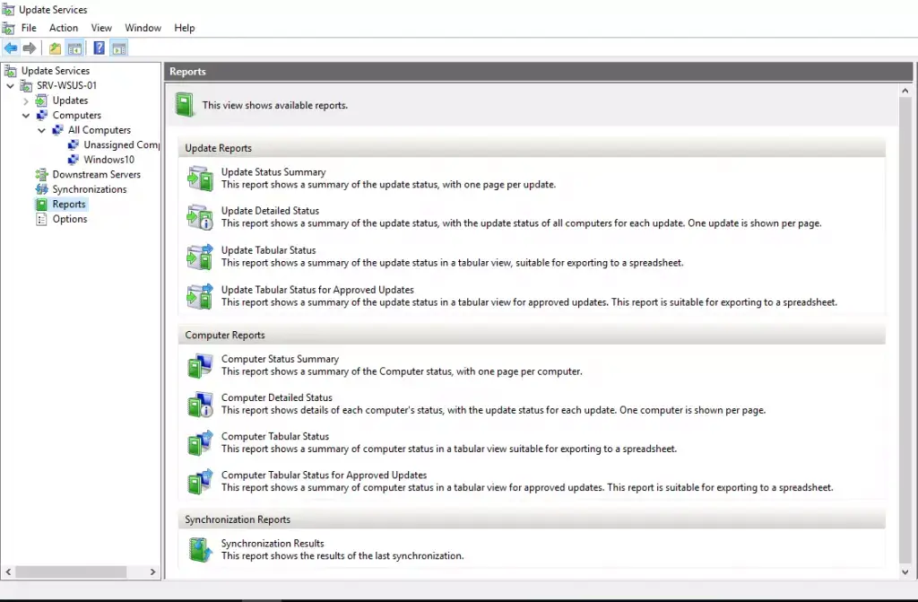 Ostatnią sekcją, która zostanie omówiona w artykule są raporty WSUS. Wybierz z konsoli WSUS Reports, a następnie kliknij na interesujący Ciebie raport, stan wdrożenia aktualizacji, raporty synchronizacji oraz raporty komputerów.