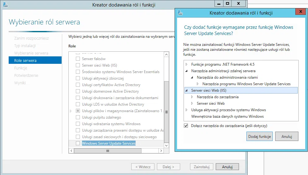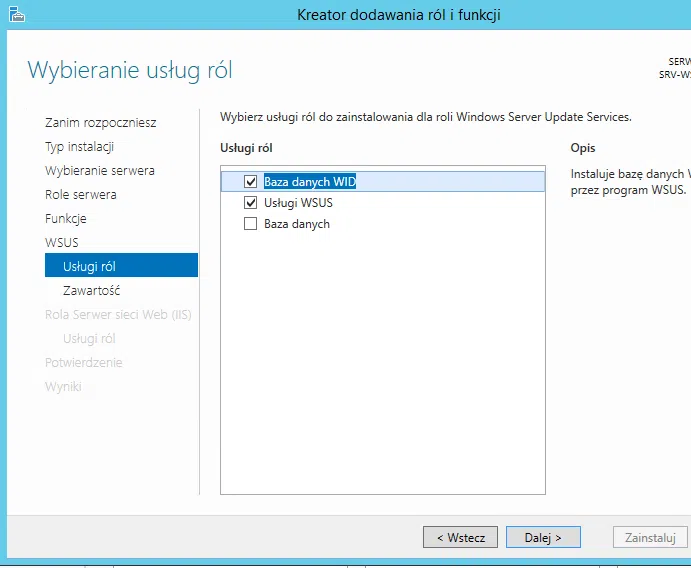 Przy instalacji usług WSUS na serwerze dodatkowo zostaną zainstalowane następujące role: