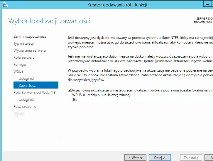 Usługi WSUS instalujemy jako rolę systemu Windows. Jeśli rola WSUS jest niewidoczna w menedżerze serwera, należy pobrać wszystkie aktualizacje z Windows Update.