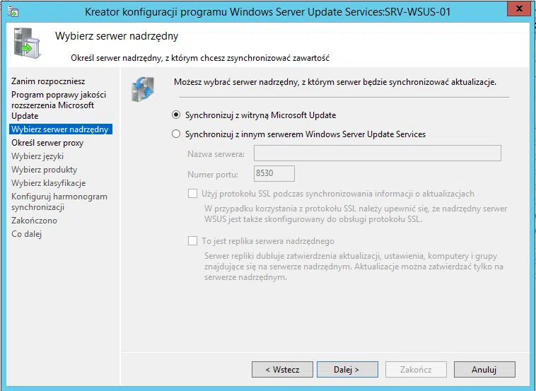 - Serwerem nadrzędnym będzie inny serwer WSUS – wtedy to będzie serwer podrzędny (tzw. Autonomiczny);