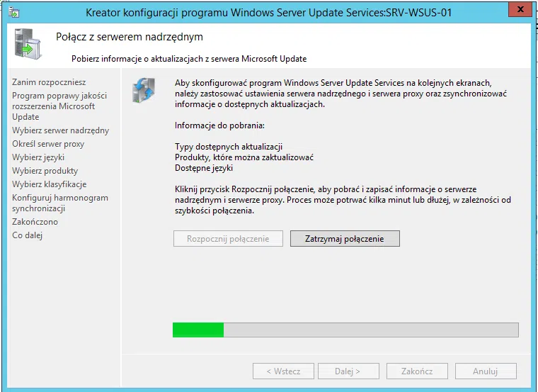 Po tym procesie udało się wdrożyć rolę WSUS. Następnym etapem jest wstępna konfiguracja usług WSUS na serwerze.