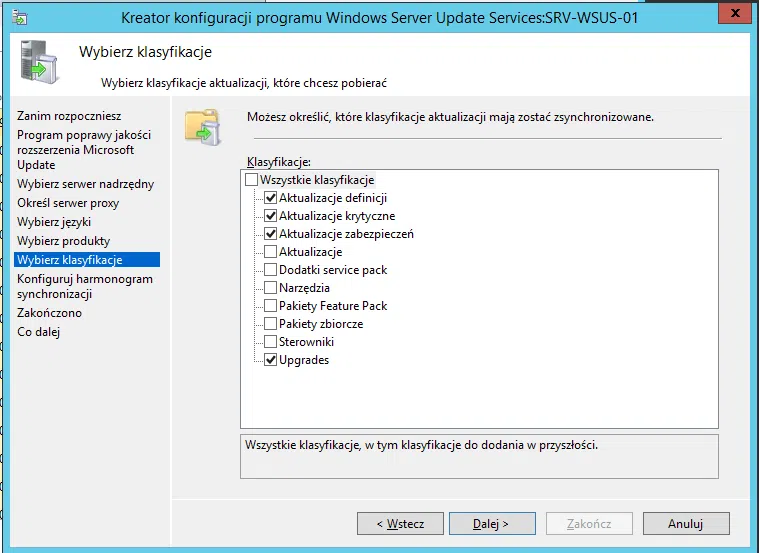 9. W następnym ekranie trzeba określić klasyfikacje aktualizacji do pobrania. Zalecam pozostawić te opcje bez zmian. Im więcej wybierzemy, tym dłużej będzie trwała synchronizacja z serwerem nadrzędnym.